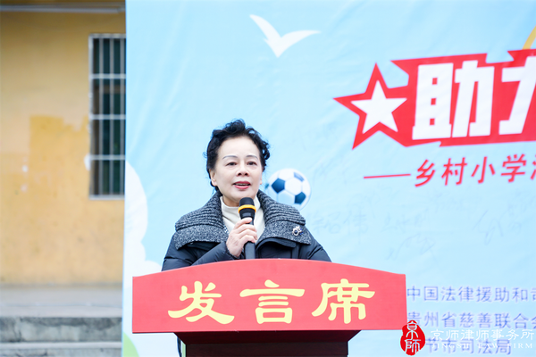 物资捐赠环节,五名学生代表为捐赠方代表系上红领巾。随后,贵州省慈善联合会陈鸣明会长、中国法律援助和司法行政英烈关爱救助基金会代表田然、省司法厅王宗宇主任、百年聚公益基金会代表许晓蕾、京师(贵阳)律所李霞主任共同向两所学校发放了爱心物资。
