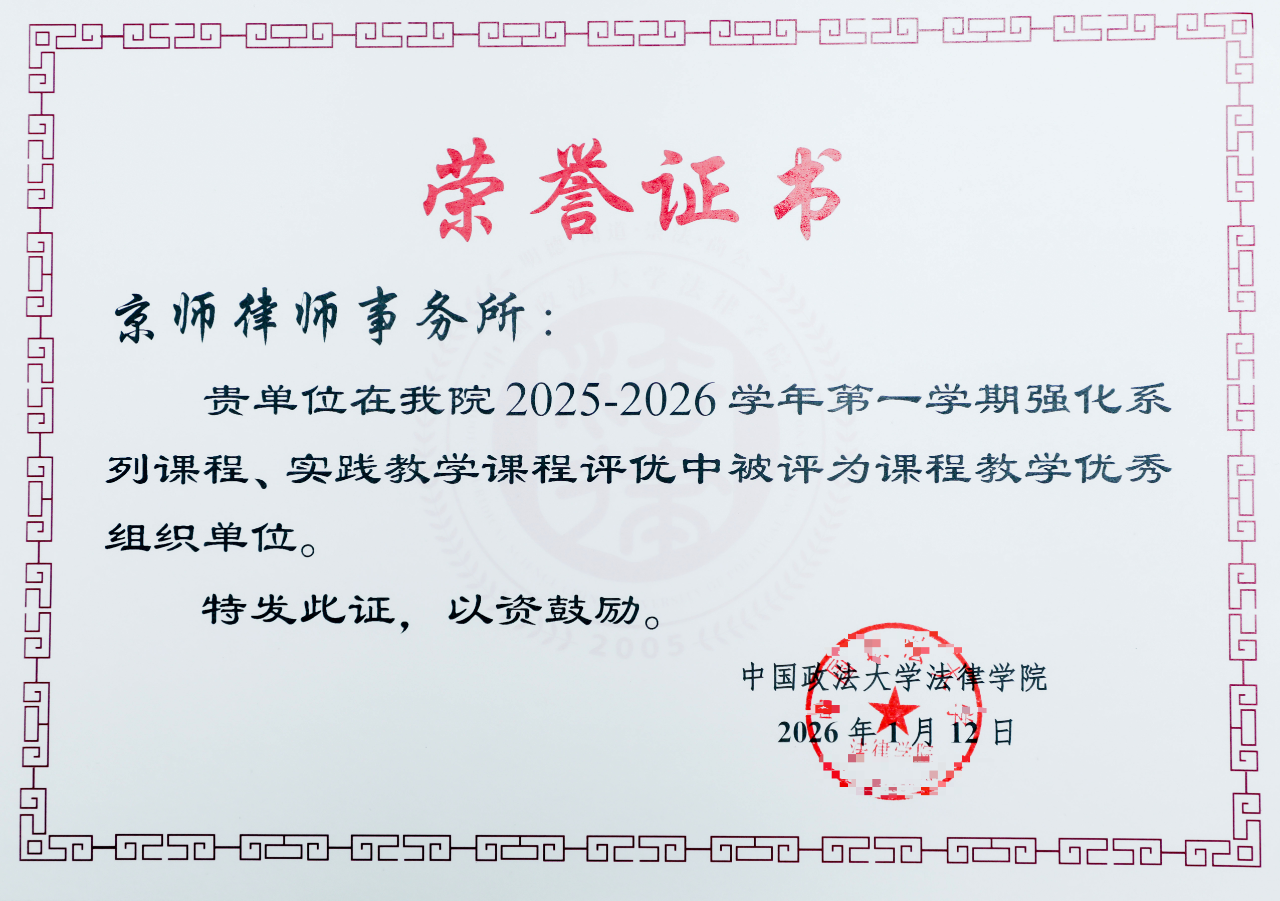 近日,京师律所在中国政法大学法律学院2025-2026学年第一学期强化系列课程、实践教学课程评优中被评为“课程教学优秀组织单位”。京师律所党委书记、主任张凌霄,京师律所合伙人、商标及不正当竞争法律事务部主任钟兰安,京师律所合伙人、京师律所(全国)商仲委秘书长郭松阳,京师律所企业债权债务法律事务部主任柴根修同获中国政法大学法律学院感谢信。