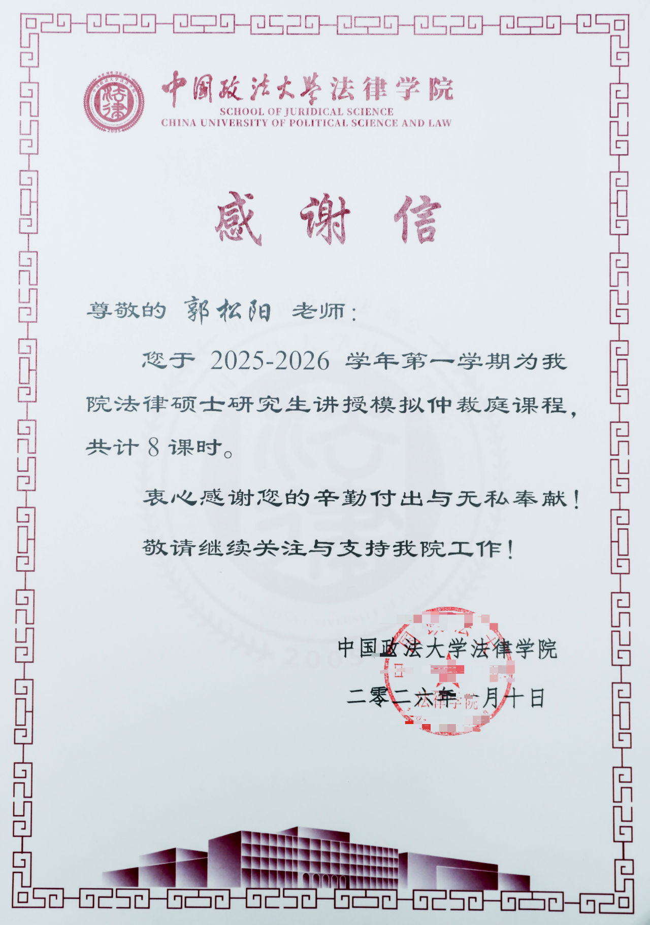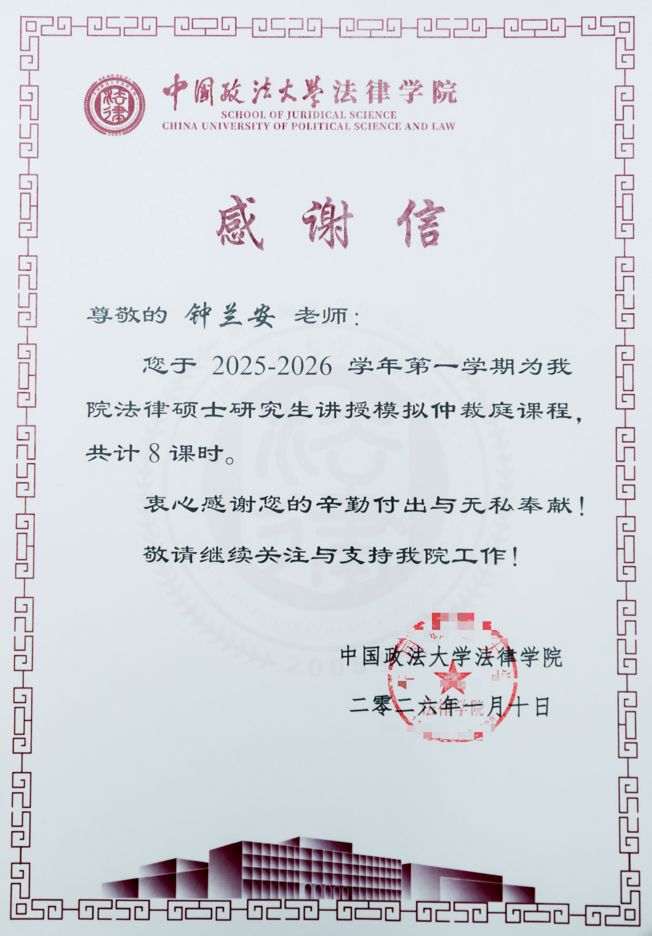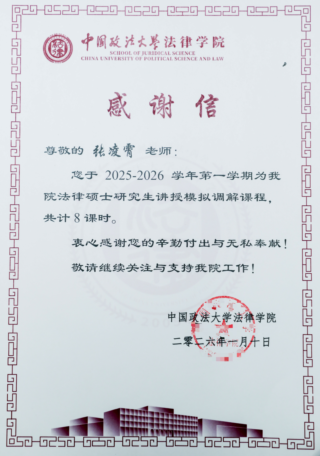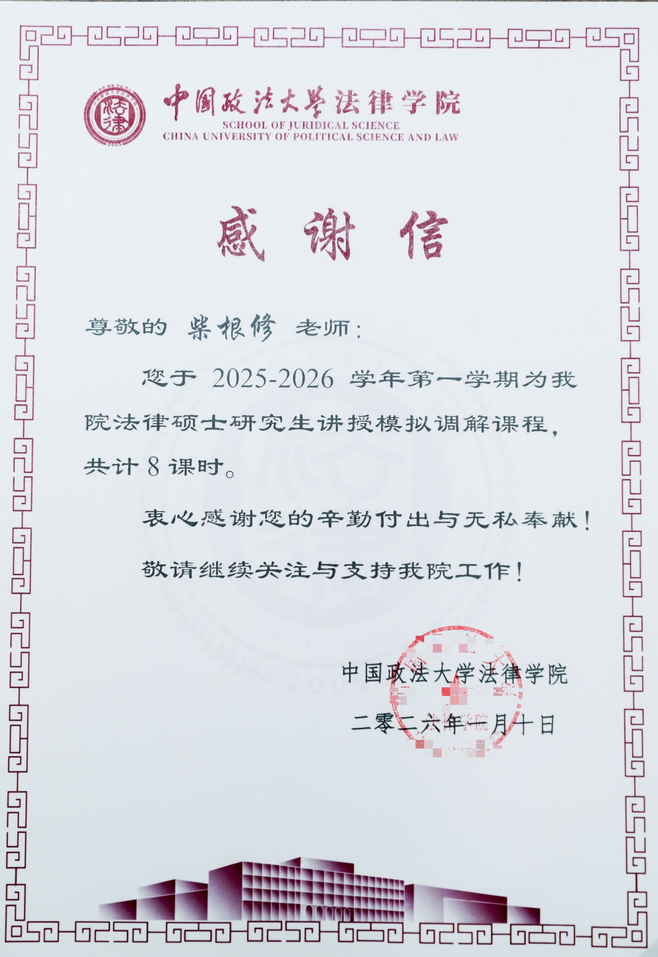 协同育人,硕果同彰。感谢信指出,京师律师在2025-2026学年第一学期为中国政法大学法律学院法律硕士研究生讲授模拟调解及仲裁庭课程分别共计8课时。学院特此向参与授课的律师致以敬意与感谢,同时希望继续关注与支持法律学院工作。