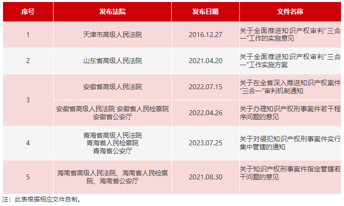 蓝图绘就,地方尽可踏着足迹“各显神通”(部分示例如下表)。截止2023年底,全国已有25家高级法院、242家中级法院和287家基层法院实现了知识产权民事、行政、刑事案件“三合一”的集中管辖和统一审理。目前除不实施知识产权“三合一”改革的北京、上海、广东三地,以及西藏、宁夏等极少地区未全面实施外,“三合一”司法体制改革已基本覆盖全国。