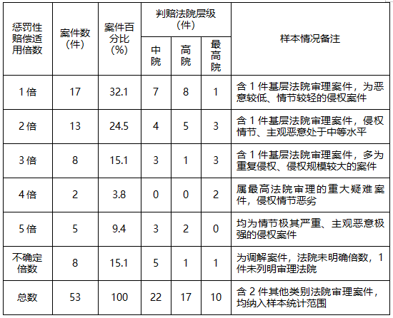 在《<最高人民法院关于审理侵害知识产权民事案件适用惩罚性赔偿的解释>的理解与适用》中明确指出,惩罚性赔偿的倍数可以是非整数,法院可根据案件具体情况灵活确定1.5倍、2.3倍等小数倍数,以实现赔偿数额的精准化。但结合本次《知产财经》53件样本案件的全面梳理可知,所有确定赔偿倍数的有效样本案件,均采用正整数倍数,未出现任何小数或分数倍数的情形。