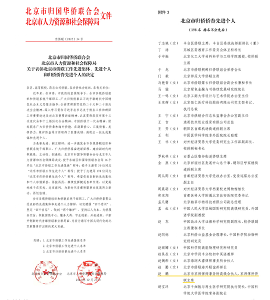 为表彰先进、树立榜样,进一步激发全市各级侨联组织和侨联系统干部职工、广大归侨侨眷奋进新征程、建功新时代的积极性、主动性、创造性,12月30日,北京市归国华侨联合会与北京市人力资源和社会保障局发布了关于表彰北京市侨联工作先进集体、先进个人和归侨侨眷先进个人的决定,授予东城区归国华侨联合会等16个单位“北京市侨联工作先进集体”称号;授予王潇等50位同志“北京市侨联工作先进个人”称号;授予丁志艳等198位同志“北京市归侨侨眷先进个人”称号。京师律所合伙人、京师侨联主席赵鹏凭借在侨联工作、专业服务与社会责任等方面的突出表现,荣获“北京市归侨侨眷先进个人”称号。
