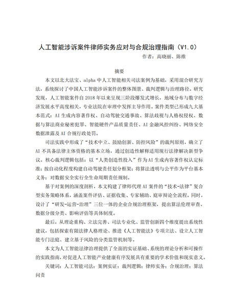 本课题《人工智能涉诉案件律师实务应对与合规治理指南(V1.0)》立足司法实践前沿,通过系统梳理全国典型判例,深入剖析AI案件在证据认定、责任划分、法律适用等方面的裁判规则;结合律师代理实务经验,提炼从诉前评估到庭审应对的全流程操作指引;并基于企业合规需求,构建涵盖算法审计、数据合规、产品责任等多维度的AI治理框架。研究成果旨在为律师代理提供工具,为企业合规提供方案,推动人工智能在法治轨道上健康发展。