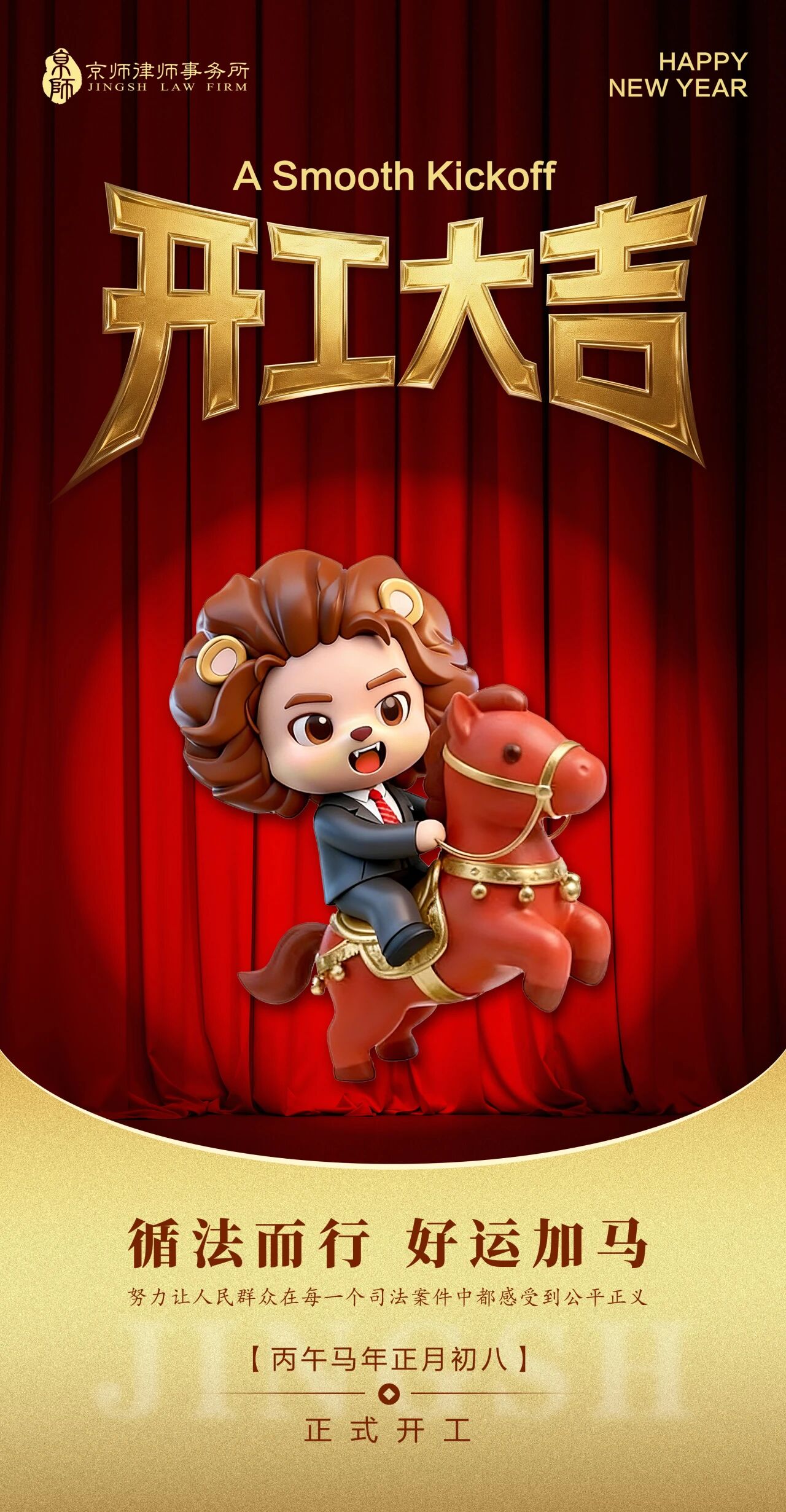 丙午新岁,马跃新程。作为京师大家庭的一员,2026年,我将继续站在京师的基石之上,秉持“初心如磐,笃行致远”的信念,助力律所专业化建设与品牌化发展。我将充分发挥京师妇联的桥梁作用,凝聚巾帼力量,关注女性与未成年人权益保护,为青年律师搭建成长平台。愿我们的律所如骏马奔腾,势不可挡;愿每一位京师人都能策马扬鞭,共赴璀璨未来!
