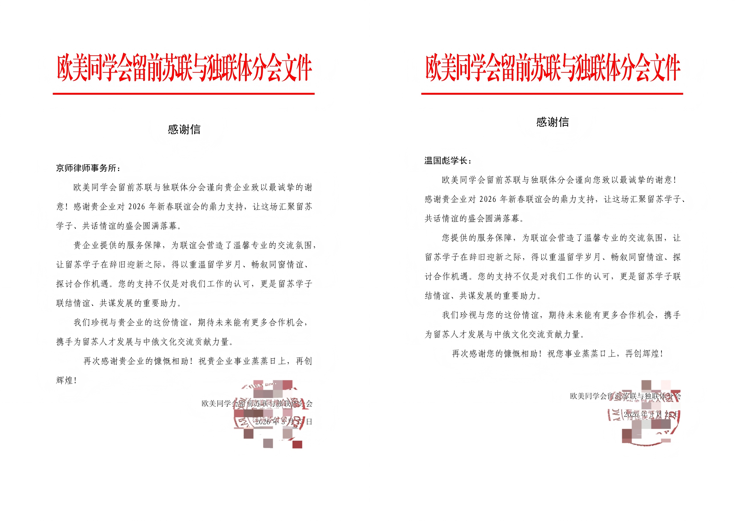 近日,京师律所及京师律所“一带一路”中俄法商服务中心主任温国彪收到欧美同学会留苏分会发来的感谢信。信中,留苏分会对于京师律所对2026 年新春联谊会的鼎力支持表示衷心感谢,并表达了进一步巩固友谊、共谋发展的诚挚期待。