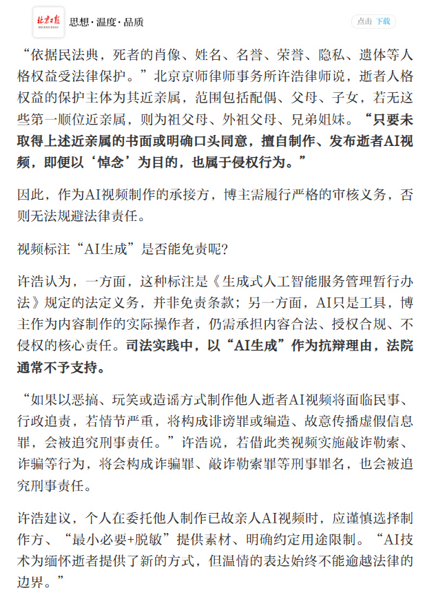 近日,短视频平台上一则“这些视频由爱生成”的话题登上热搜,引发社会广泛关注。起因是有博主借助最新AI视频技术,逼真重现网友逝去亲人的音容笑貌,视频下方标注的“内容由AI生成”被网友深情解读为“内容由爱生成”,点赞量超过26万。针对这一现象背后的法律风险与伦理边界,京师律师许浩在《北京日报》采访中,从法律专业角度作出解读。